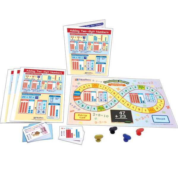 The Adding Two-digit Numbers Learning Center provides materials for 4 students and includes 1 Curriculum Mastery Game (featuring 1 set of 30 illustrated self-checking question cards and 1 laminated double-sided game board & game pieces for up to 4 players) and 4 Visual Learning Guides focused on the same topic.