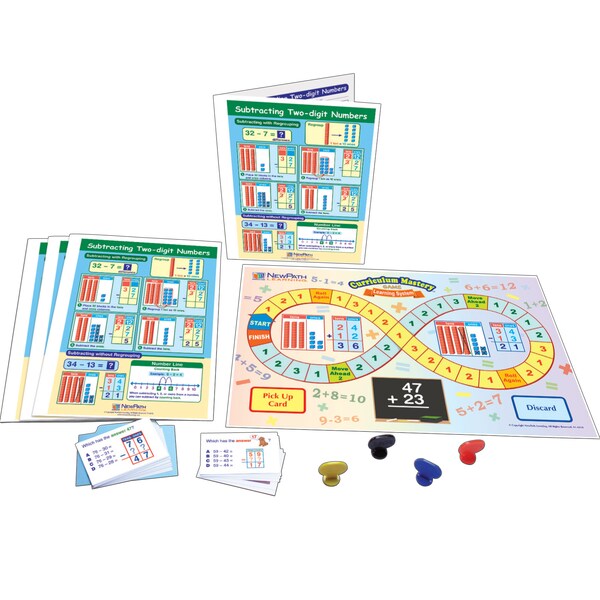The Subtracting Two-digit Numbers Learning Center provides materials for 4 students and includes 1 Curriculum Mastery Game (featuring 1 set of 30 illustrated self-checking question cards and 1 laminated double-sided game board & game pieces for up to 4 players) and 4 Visual Learning Guides focused on the same topic.