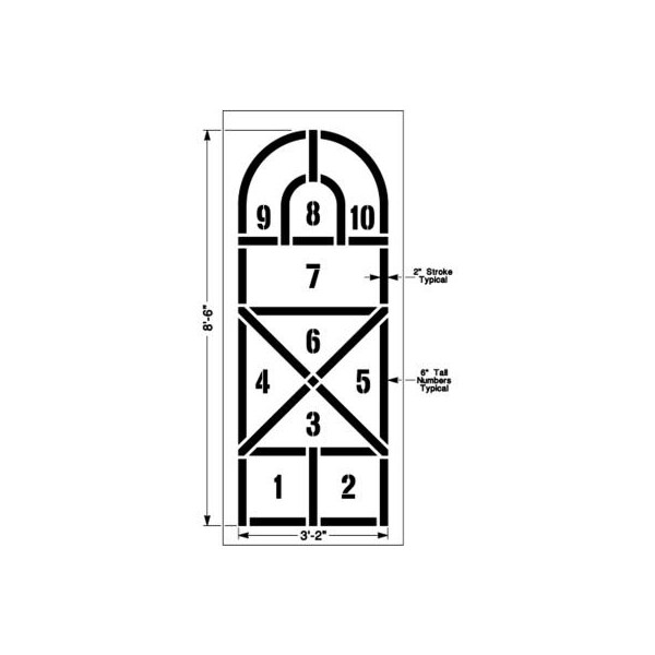 Quickly paint the hopscotch game on playground surfaces with this modern take on the traditional hopscotch stencil. Stencil measeure 102ines long by 38ines' wide. 1/8in thick polytough material has a lifetime warranty that allows stencil to be used over and over. Stencil image dimensions are 38inw x 102inh.