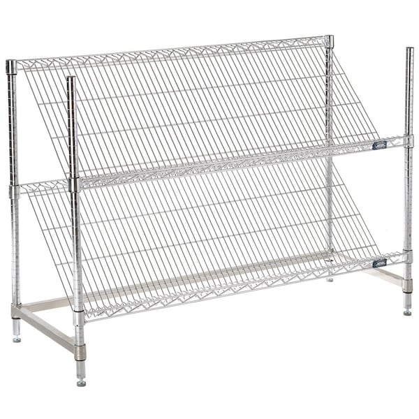 Nexel Chrome, 2 Tier, Slant Wire Shelving, Starter Unit, 48inW x 18inD x 34inH. Chrome Starter Units are versatile enough for retail display, but withstand warehouse conditions as well. Starter Unit includes 4 posts with leveling feet, 2 slant shelves, 1 dunnage frame and plastic snap on sleeves to secure shelves to posts. Features: Reinforced shelves with welded surface ribs for added strength. Open design to maximize air and light circulation and minimize dust accumulation. Includes 4 posts, 2 slant shelves, 1 dunnage frame and snap on sleeves . Shelves easily adjust without tools at 1in increments. NSF approved.
