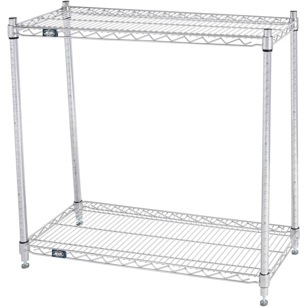 Simple tool-free assembly. 800 lbs. capacity of evenly distributed weight. Open design allows air and light circulation while minimizing dust accumulation. Simplify storage in your facility with our Nexel Chrome Wire Shelving that keeps your items neatly organized, on strong, durable, and adjustable flat-wire shelves. This freestanding wire shelving unit is made of steel construction and is suitable for a variety of dry applications, from retail display to warehouse storage. Each wire shelf adjusts in 1in increments and is reinforced with welded surface ribs for added strength to support large quantities of items. Additionally, this chrome wire shelving starter unit can be connected with optional add-on shelving units to expand the quantity of storage rows. Casters or additional shelves both sold separately can add mobility and levels. NSF approved. Includes 4 posts with levelers, 2 shelves, and snap-on sleeves. All shelves are adjustable on 1in increments. 36inW x 12inD x 34inH.