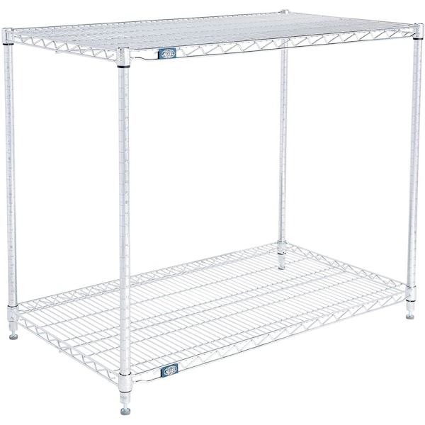 Simple tool-free assembly. 800 lbs. capacity of evenly distributed weight. Open design allows air and light circulation while minimizing dust accumulation. Simplify storage in your facility with our Nexel Chrome Wire Shelving that keeps your items neatly organized, on strong, durable, and adjustable flat-wire shelves. This freestanding wire shelving unit is made of steel construction and is suitable for a variety of dry applications, from retail display to warehouse storage. Each wire shelf adjusts in 1in increments and is reinforced with welded surface ribs for added strength to support large quantities of items. Additionally, this chrome wire shelving starter unit can be connected with optional add-on shelving units to expand the quantity of storage rows. Casters or additional shelves both sold separately can add mobility and levels. NSF approved. Includes 4 posts with levelers, 2 shelves, and snap-on sleeves. All shelves are adjustable on 1in increments. 42inW x 21inD x 34inH.