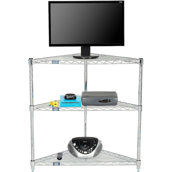 Nexel 32inW x 24inD x 34inH 3 Shelf Corner Media Stand - Chrome. Includes three heavy duty, height adjustable Wire Shelves and three 1in dia. Posts with leveling feet. Open wire design permits more light and air circulation and resists dust build-up. Ideal for media components, retail display or long lasting storage. Shelves are adjustabel in 1in increments. Holds up to 600 lbs per shelf. No tools required; shelves are held in place with special designed friction clips. Chrome plating process consists of electro-plated nickel-chrome resulting in a brilliant high gloss finish. Model 798803 will hold up to 34in Diagonall Width Flat Screen TVs & Monitors with a 16:9 wide screen aspect ration.