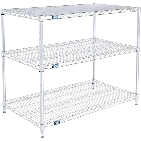 Simple tool-free assembly. 800 lbs. capacity of evenly distributed weight. Open design allows air and light circulation while minimizing dust accumulation. Simplify storage in your facility with our Nexel Chrome Wire Shelving that keeps your items neatly organized, on strong, durable, and adjustable flat-wire shelves. This freestanding wire shelving unit is made of steel construction and is suitable for a variety of dry applications, from retail display to warehouse storage. Each wire shelf adjusts in 1in increments and is reinforced with welded surface ribs for added strength to support large quantities of items. Additionally, this chrome wire shelving starter unit can be connected with optional add-on shelving units to expand the quantity of storage rows. Casters or additional shelves both sold separately can add mobility and levels. NSF approved. Includes 4 posts with levelers, 3 shelves, and snap-on sleeves. All shelves are adjustable on 1in increments. 42inW x 21inD x 34inH.