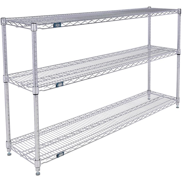 Simple tool-free assembly. 600 lbs. capacity of evenly distributed weight. Open design allows air and light circulation while minimizing dust accumulation. Simplify storage in your facility with our Nexel Chrome Wire Shelving that keeps your items neatly organized, on strong, durable, and adjustable flat-wire shelves. This freestanding wire shelving unit is made of steel construction and is suitable for a variety of dry applications, from retail display to warehouse storage. Each wire shelf adjusts in 1in increments and is reinforced with welded surface ribs for added strength to support large quantities of items. Additionally, this chrome wire shelving starter unit can be connected with optional add-on shelving units to expand the quantity of storage rows. Casters or additional shelves both sold separately can add mobility and levels. NSF approved. Includes 4 posts with levelers, 3 shelves, and snap-on sleeves. All shelves are adjustable on 1in increments. 60inW x 12inD x 34inH.