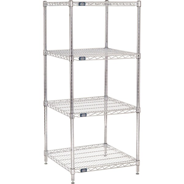 Simple tool-free assembly. 800 lbs. capacity of evenly distributed weight. Open design allows air and light circulation while minimizing dust accumulation. Simplify storage in your facility with our Nexel Chrome Wire Shelving that keeps your items neatly organized, on strong, durable, and adjustable flat-wire shelves. This freestanding wire shelving unit is made of steel construction and is suitable for a variety of dry applications, from retail display to warehouse storage. Each wire shelf adjusts in 1in increments and is reinforced with welded surface ribs for added strength to support large quantities of items. Additionally, this chrome wire shelving starter unit can be connected with optional add-on shelving units to expand the quantity of storage rows. Casters or additional shelves both sold separately can add mobility and levels. NSF approved. Includes 4 posts with levelers, 4 shelves, and snap-on sleeves. All shelves are adjustable on 1in increments. 24inW x 24inD x 54inH.