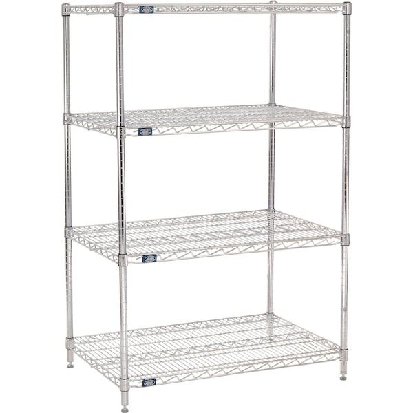 Simple tool-free assembly. 800 lbs. capacity of evenly distributed weight. Open design allows air and light circulation while minimizing dust accumulation. Simplify storage in your facility with our Nexel Chrome Wire Shelving that keeps your items neatly organized, on strong, durable, and adjustable flat-wire shelves. This freestanding wire shelving unit is made of steel construction and is suitable for a variety of dry applications, from retail display to warehouse storage. Each wire shelf adjusts in 1in increments and is reinforced with welded surface ribs for added strength to support large quantities of items. Additionally, this chrome wire shelving starter unit can be connected with optional add-on shelving units to expand the quantity of storage rows. Casters or additional shelves both sold separately can add mobility and levels. NSF approved. Includes 4 posts with levelers, 4 shelves, and snap-on sleeves. All shelves are adjustable on 1in increments. 36inW x 24inD x 54inH.