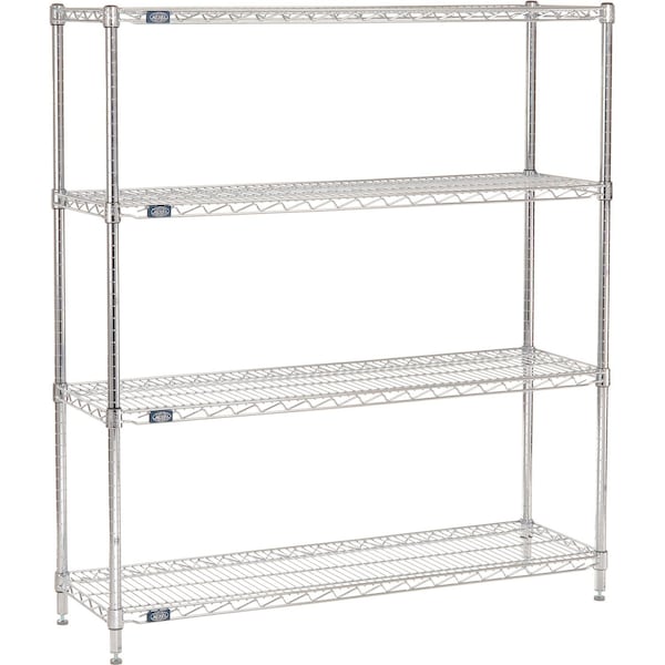 Simple tool-free assembly. 600 lbs. capacity of evenly distributed weight. Open design allows air and light circulation while minimizing dust accumulation. Simplify storage in your facility with our Nexel Chrome Wire Shelving that keeps your items neatly organized, on strong, durable, and adjustable flat-wire shelves. This freestanding wire shelving unit is made of steel construction and is suitable for a variety of dry applications, from retail display to warehouse storage. Each wire shelf adjusts in 1in increments and is reinforced with welded surface ribs for added strength to support large quantities of items. Additionally, this chrome wire shelving starter unit can be connected with optional add-on shelving units to expand the quantity of storage rows. Casters or additional shelves both sold separately can add mobility and levels. NSF approved. Includes 4 posts with levelers, 4 shelves, and snap-on sleeves. All shelves are adjustable on 1in increments. 54inW x 14inD x 54inH.