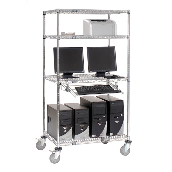 Nexel 4-Shelf Mobile Wire Computer LAN Workstation with Keyboard Tray, 36inW x 24inD x 69inH, Chrome. Nexel Mobile LAN Shelving Workstation holds your LAN equipment in one organized work center Printouts and information can be accessed without running to different locations. Wire construction promotes air circulation and prevents dust build-up. 69inH LAN Shelving comes with four shelves. LAN units come with one slide-out keyboard shelf with wrist rest, for keyboards up to 23inW x 11inD. Four 5in polyurethane swivel casters two with brakes for complete mobility. Order additional shelves and keyboard drawers for LAN shelving only to suit your needs. Attractive chrome-plated finish. Easy Assembly.
