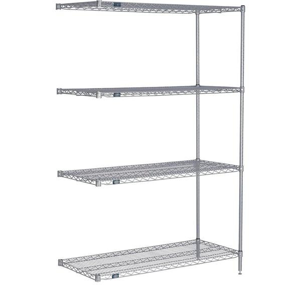 Nexelate Silver Epoxy Wire Shelving Add-On 48inW x 24inD x 63inH. Add-On shelving units allow unit expansion to make the most of storage space. Includes 2 posts with leveling feet, 4 shelves, snap-on sleeves and S-hooks to join units. Nexelate is an attractive finish that consists of a Silver Epoxy powder-coat over a rust inhibiting undercoat. NSF approved for wet or dry use. Features: Reinforced shelves with welded surface ribs for added strength. Open design to maximize air and light circulation and minimize dust accumulation. Includes 4 shelves, 2 posts, snap-on sleeves and S-hooks to join units. Shelves easily adjust without tools at 1in increments. NSF approved for wet or dry use.