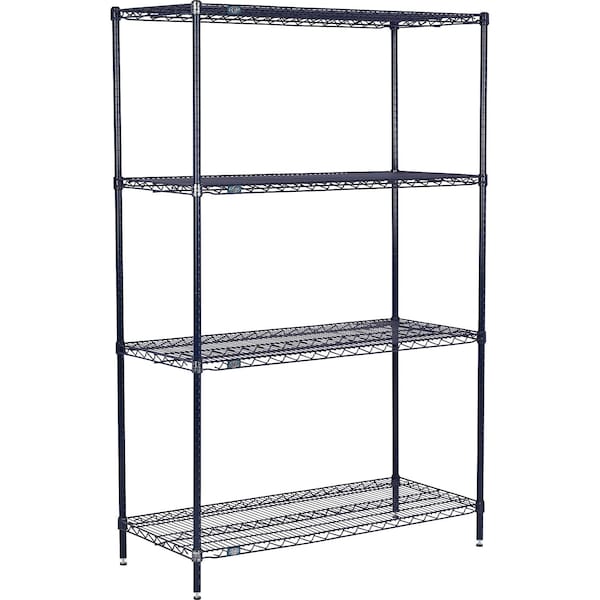 Nexelon Wire Shelving Starter, 42inW x 21inD x 54inH. Nexelon Starter Units feature a top of the line blue metallic finish designed to handle extreme wet, hot or cold environments. Starter Unit includes 4 posts with leveling feet, 4 wire shelves and plastic snap on sleeves to secure shelves to posts. NEXGard, an anti-microbial agent, protects the epoxy coating from bacteria, mold, and mildew that causes odors and product degradation. Features: Reinforced shelves with welded surface ribs for added strength. Open design to maximize air and light circulation and minimize dust accumulation. Includes 4 posts, 4 shelves and snap on sleeves. Shelves easily adjust without tools at 1in increments. NEXGard anti-microbial agent. NSF approved for wet or dry use.