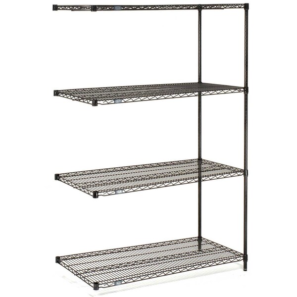 . Add-On shelving units allow unit expansion to make the most of storage space. Includes 2 posts with leveling feet, 4 shelves, snap-on sleeves and S-hooks to join units. Black Epoxy is an attractive, rugged and affordable finish. This epoxy wire shelving is NSF approved for wet or dry use. Reinforced shelves with welded surface ribs for added strength. Open design to maximize air and light circulation and minimize dust accumulation. Includes 4 shelves, 2 posts, snap-on sleeves and S-hooks to join units. Shelves easily adjust without tools at 1 increments. NSF approved for wet or dry use.