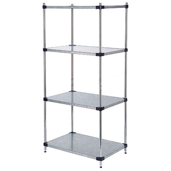 . Solid Galvanized Starter Units allow for display and storage of small equipment and instruments. Steel shelves feature a dual layer construction that provides strength and rigidity and is temperature and moisture resistant. Starter Unit includes 4 posts with leveling feet, 5 solid galvanized shelves and plastic snap on sleeves to secure shelves to posts. 18 Gauge. Raised lip surrounding the edge of each shelf to prevent spills from overflowing. Open styling to allow shelves to be reached from all sides. Includes 4 posts, 5 shelves and snap on sleeves. Shelves easily adjust without tools at 1 increments. NSF approved for wet or dry use.