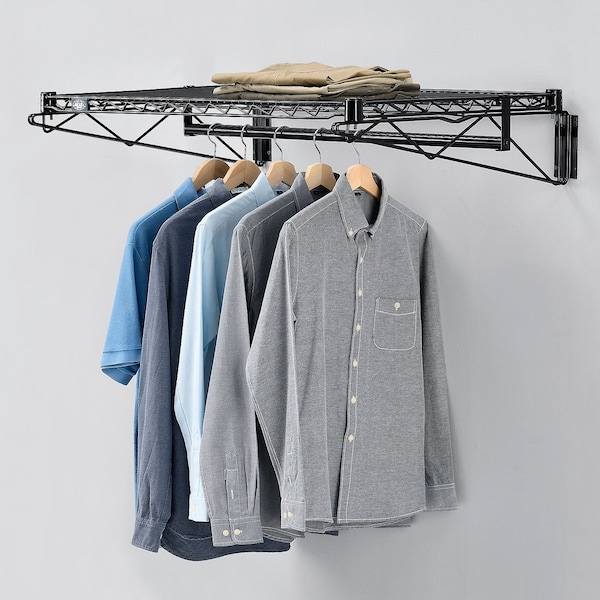 Nexel Wall Coat Rack - 36inW x 24inD x 6inH - Black. This Wall Mount Coat Rack is an attractive solution to garment storage. Durable black epoxy coated steel wire design minimizes dust accumulation and maximizes ventilation. Resists denting, chipping and rusting. Quick assembly - easily attaches to wall surface. 24inD x 36inW.