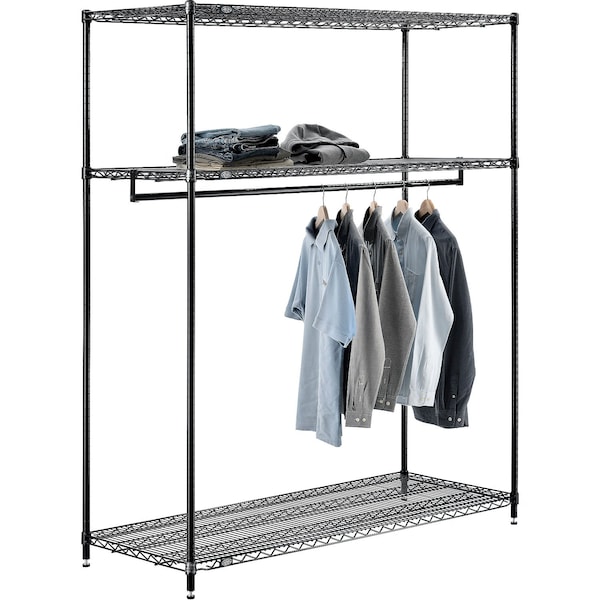 Nexel 3 Shelf Garment Floor Rack - Black. Attractive solution to garment storage. Durable black epoxy steel wire design minimizes dust accumulation. Resists denting, chipping and rusting. The full length coat rod holds up to 250 lbs. Dimension: 24inD x 60inW x 74inH. Assembles quickly. Optional casters and hangers available.