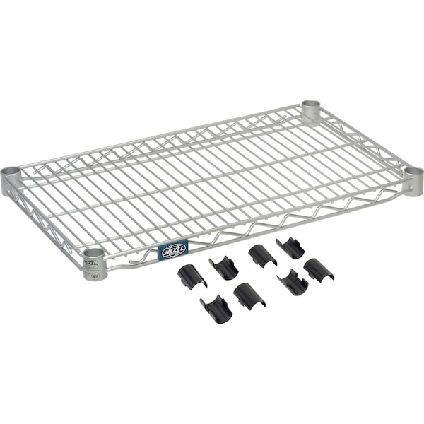 Nexel S1424EP Nexelate Wire Shelf 24inW x 14inD. Customize your shelving units with additional shelves or mix shelves and posts to create a custom unit. Nexelate is an attractive finish that consists of a Silver Epoxy powder-coat over a rust inhibiting undercoat. NSF approved for wet or dry use. Features: Open design to maximize air and light circulation and minimize dust accumulation. Includes 1 shelf and 4 shelf clips. Shelves easily adjust without tools at 1in increments. NSF approved for wet or dry use.
