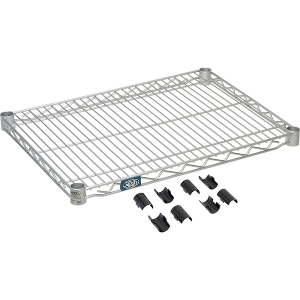 Nexel S1824EP Nexelate Wire Shelf 24inW x 18inD. Customize your shelving units with additional shelves or mix shelves and posts to create a custom unit. Nexelate is an attractive finish that consists of a Silver Epoxy powder-coat over a rust inhibiting undercoat. NSF approved for wet or dry use. Features: Open design to maximize air and light circulation and minimize dust accumulation. Includes 1 shelf and 4 shelf clips. Shelves easily adjust without tools at 1in increments. NSF approved for wet or dry use.