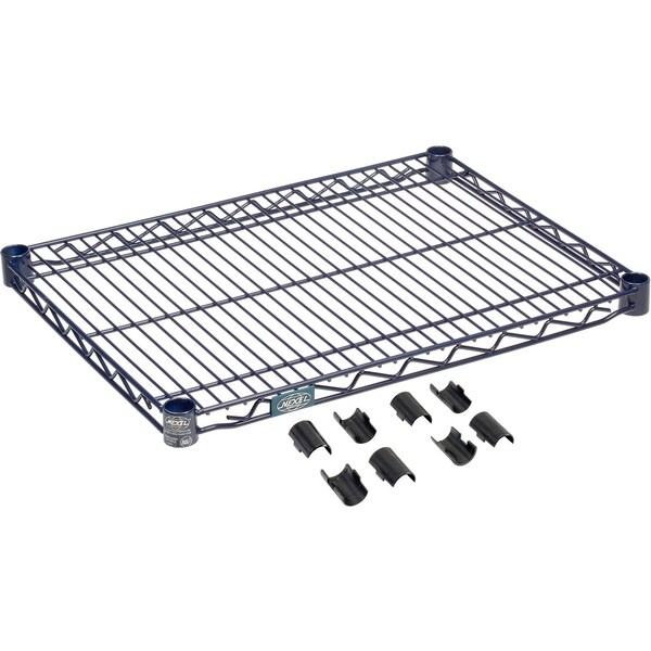 Nexel S1824N Nexelon Wire Shelf 24inW x 18inD. Customize your shelving units with additional shelves or mix shelves and posts to create a custom unit. Nexelon features a top of the line blue metallic finish designed to handle extreme wet, hot or cold environments. NEXGard, an anti-microbial agent, protects the epoxy coating from bacteria, mold, and mildew that causes odors and product degradation. NSF approved for wet or dry use. Features: Open design to maximize air and light circulation and minimize dust accumulation. Includes 1 shelf and 4 shelf clips. Shelves easily adjust without tools at 1in increments. NEXGard anti-microbial agent. NSF approved for wet or dry use.