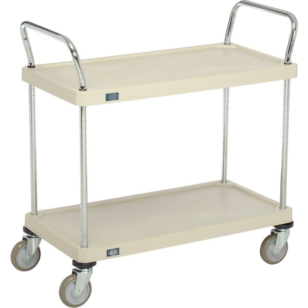 Heavy Duty Utility Cart ideal for use in restaurants, offices, warehouses, schools and just about anywhere. Strong solid plastic shelves provide increased capacity and easy to clean surfaces. Shelves can be easily adjusted on 1 inch increments with numbered markings. Rolls smoothly on 5 polyurethane stem casters, 2 with brakes. 600 lb. load capacity. NSF approved for dry use.