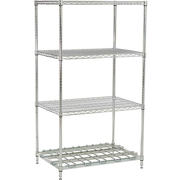 Poly-Z-Brite Starter Units with Dunnage Bottom Shelf are designed with a clear epoxy finish that handles temperature and moisture extremes well. Starter Unit includes 4 posts with leveling feet, 3 wire shelves, 1 bottom dunnage shelf and plastic snap on sleeves to secure shelves to posts.