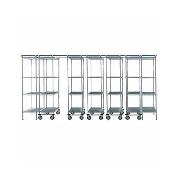 High density mobile storage systems help you double your storage capacity using minimal space. These unique overhead track systems provide instant access to inventory while freeing floor space and increasing the number of shelving units used in a designated area. Ideal for dry storage, coolers and walk-in freezers. Utilizes 2 stationary units; one on each end, connected with an overhead track that allows mobile shelving units in between to smoothly shift side-to-side for easy access to inventory and stock items. Includes two 12ftftL overhead stainless steel tracks. Guide tracks connect units together for an easy slide-along track shelving system. 4 height adjustable shelves on each shelving unit features an open wire design for air, light and sprinkler penetration while minimizing dust accumulation. Shelves adjust at 1in increments. Each mobile unit includes 4 5in dia.in polyurethane casters. Chrome features an electro-plated nickel-chrome finish for a brilliant high gloss. Assembly required.SPACE-TRAC HIGH DENSITY MOBILE STORAGE Chrome 4-Unit Shelving System High density mobile storage systems help you double your storage capacity using minimal space. These unique overhead track systems provide instant access to inventory while freeing floor space and increasing the number of shelving units used in a designated area. Ideal for dry storage, coolers and walk-in freezers. Utilizes 2 stationary units; one on each end, connected with an overhead track that allows mobile shelving units in between to smoothly shift side-to-side for easy access to inventory and stock items. Includes two 14ftL overhead stainless steel tracks. Guide tracks connect units together for an easy slide-along track shelving system. 4 height adjustable shelves on each shelving unit features an open wire design for air, light and sprinkler penetration while minimizing dust accumulation. Shelves adjust at 1in increments. Each mobile unit includes 4 5in polyurethane casters. Chrome features an electro-plated nickel-chrome finish for a brilliant high gloss. Assembly required.