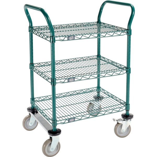 Poly-Green Utility Cart open design offers convenient 4-way access while minimizing dust accumulation and maximizing light and sprinkler penetration. Shelves can be easily adjusted on 1 inch increments with numbered markings. Rolls smoothly on 5 polyurethane stem casters, 2 rigid, 2 swivel with brakes. 1200 lb load capacity. Poly-Green features a green powder-epoxy over zinc-chromate electro-plating that handles temperature and moisture extremes well. NSF approved for wet or dry use.