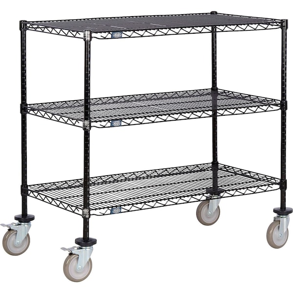Nexel Shelf Carts open design offers convenient 4-way access while minimizing dust accumulation and maximizing light and sprinkler penetration. Shelves can be easily adjusted on 1 inch increments with numbered markings. Rolls smoothly on 5in polyurethane stem casters, 2 with brakes. 1200 lb load capacity. Black Epoxy features an attractive, rugged and affordable finish ideal for offices, retail stores, warehouses and more. This epoxy wire shelving is NSF approved for wet or dry use. Limited seven year warranty against rust and corrosion. Features: Open design to maximize air and light circulation and minimize dust accumulation. Includes 3 shelves, 4 posts, and 4 polyurethane swivel casters, 2 with brakes. Shelves easily adjust without tools at 1in increments. NSF approved for wet or dry use.