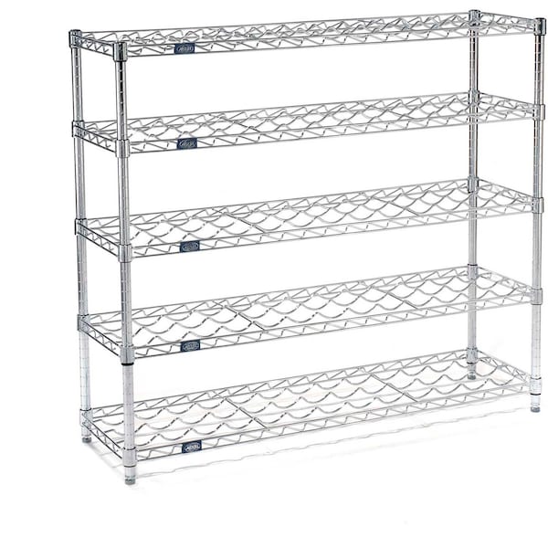 Nexel WS14365C Wine Bottle Rack - 45 Bottle 36inW x 14inD x 42inH. Wine Bottle Racks are an attractive and safe way to display and store wine bottles. Each bottle is securely cradled by heavy gauge wire to prevent movement. Adjustable shelves allow storage of many different sizes of bottles. Our open wire construction permits air to circulate around the bottles for an even temperature. The 36in wide shelves accommodate 9 bottles and the 48in wide shelves accommodate 13 bottles. Each shelf level holds up to 100 lbs. Posts include bottom Leveling Feet and top Post Caps. For added protection, place a 4in ledge along the rear of the shelf. The use of 188735 Foot Plate is recommended for additional stability. b>Chrome plating process consists of electro-plated nickel-chrome resulting in a brilliant high gloss finish. Open Wire truss reinforced shelves. Open design maximizes air and light circulation and minimizes dust accumulation.