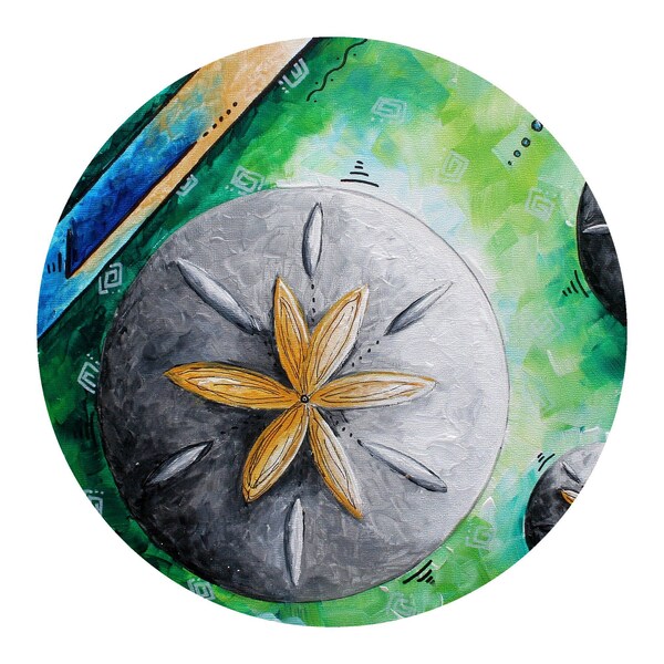 Our round wall art with the "Sand Dollar" image. Laser cut from steel. Powder coated for weather resistance and durability. Dye-sublimated for a vibrant full image. Hanging brackets are attached to the piece for easy hanging of the product. Dimensions: 12 in. L x 12 in. H x 1 in. D Weight:1 lb