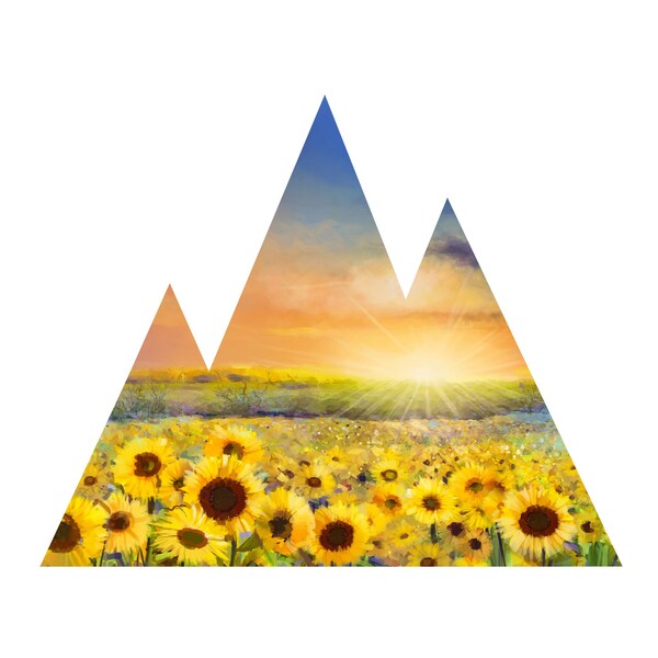 Our three peaks wall art with the Sunflower image. A painting of sunflowers in a field and a sunrise. The piece comes with brackets attached for ease of hanging. Dimensions: 23 in. L x 19 in. H x 1 in. D Weight: 5lb