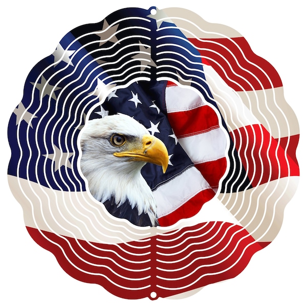 Our outdoor metal yard art has always been among our most popular products! Our Eagle Flag wind spinner is a great looking piece of outdoor metal yard art! Featuring a beautiful "Eagle Flag" image on our classic wind spinner. Like all our products, our Eagle Flag Wind Spinner is powder coated for maximum rust resistance, making it ideal for use as outdoor metal yard art! The Eagle Flag wind spinner comes with a swivel on top so all you have to do is buy it, fan it out, hang it up, and watch it spin in the wind! Dimensions: 36 in. L x 36 in. H x 1 in. D Weight: 11lb