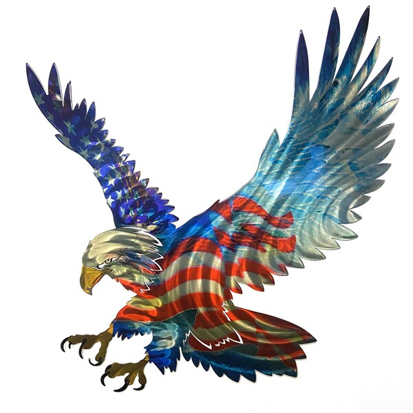 Our metal wall art independence eagle is a great looking piece of metal wall art and a fine addition to any home decor or lawn and garden decor collection! Like all our products our metal wall art independence eagle is made of steel, making it one of the most durable and longest lasting metal wall art products on the market! Metal wall art eagles come with a hang tab on the back for easy hanging! Dimensions: 31 in. L x 36 in. H x 1 in. D Weight: 6 lb