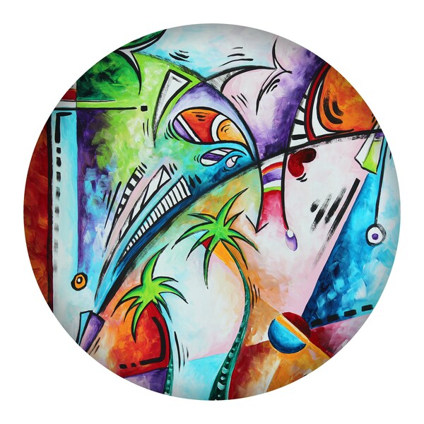 Our round wall art with the "Tropical Dance" image. Laser cut from steel. Powder coated for weather resistance and durability. Dye-sublimated for a vibrant full image. Hanging brackets are attached to the piece for easy hanging of the product. Dimensions: 36 in. L x 36 in. H x 1 in. D Weight: 14 lb