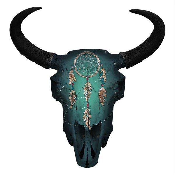 Bison skull wall art. European mount style with a Dreamcatcher image. Take home a piece of American art that will give your walls the feel of the rustic frontier. Comes with attached wall hanging brackets for ease of hanging. Laser cut from steel. Powder coated for weather resistance and durability. Dye-sublimated for a vibrant full image. Dimensions: in. L x 20 in. H x 1 in. D Weight: 3lb