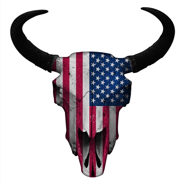 Bison skull wall art. European mount style with an American flag image. Take home a piece of American art that will give your walls the feel of the rustic frontier. Comes with attached wall hanging brackets for ease of hanging. Laser cut from steel. Powder coated for weather resistance and durability. Dye-sublimated for a vibrant full image. Dimensions: in. L x 20 in. H x 1 in. D Weight: 3lb