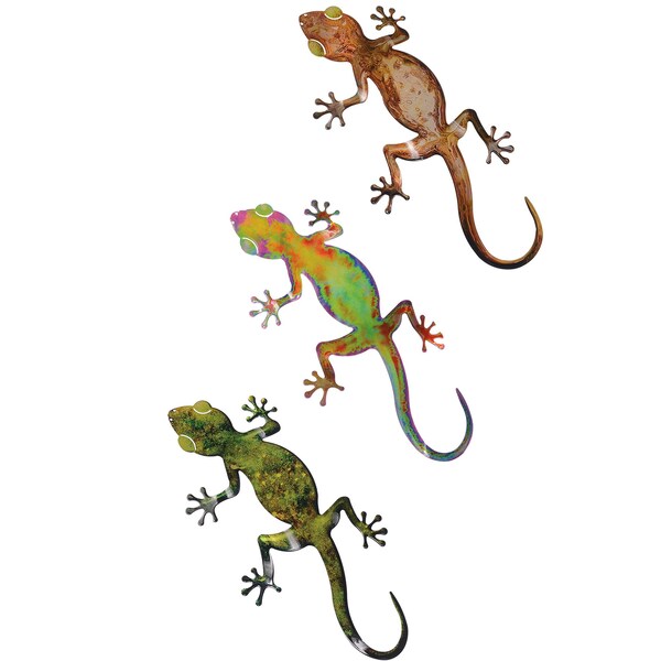 Our metal wall art gecko set has always been one of our most popular items! Like all our metal wall art products, our metal wall art gecko set is powder coated for maximum rust resistance, making them ideal for use as indoor or outdoor metal wall art! Set contains three geckos, each measuring 12"x6" and coming with a hang tab on back for easy hanging! Dimensions: 6 in. L x 12 in. H x 1 in. D Weight: 2lb