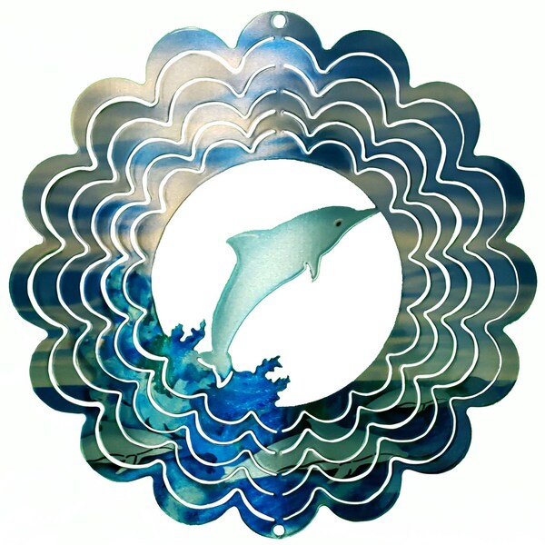 Our is a great looking piece of outdoor metal yard art! Featuring a beautiful "kaleidoscope dolphin" cut out wind spinner. Like all our products, our is powder coated for maximum rust resistance, making it ideal for use as outdoor metal yard art! The comes with a swivel on top so all you have to do is buy it, fan it out, hang it up, and watch it spin in the wind! Dimensions: 11 in. L x 11 in. H x 1 in. D Weight: 2lb