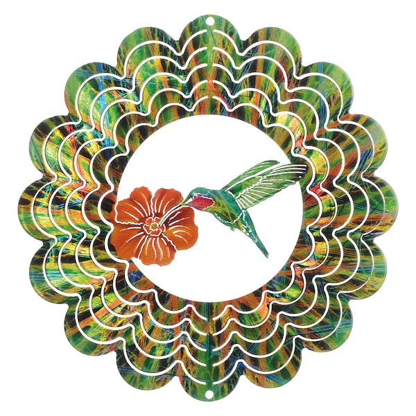 Our green hummingbird wind spinner is one of our consistently best sellers! Like all our products our medium green hummingbird wind spinner is powder coated for maximum rust resistance making it ideal for use as outdoor garden decor! Our medium wind spinners come with a swivel on top so you can buy it, hang it, and watch it spin in the wind! Dimensions: 11 in. L x 11 in. H x 1 in. D Weight: 2lb