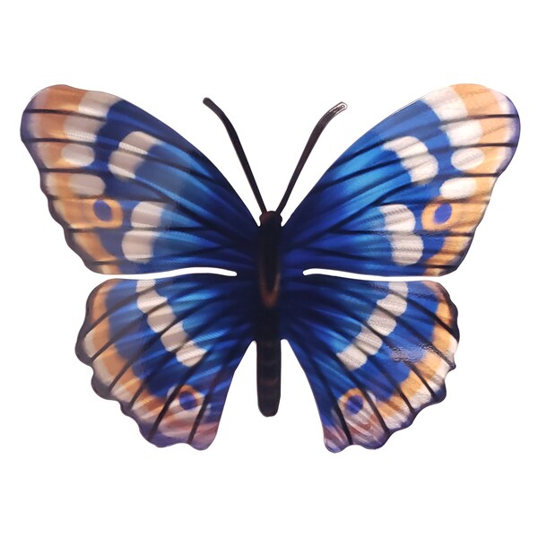 Bring natural elegance to your decor with this new butterfly art. The Sapphire butterfly art is a striking addition to any indoor or outdoor living space. Hand crafted from steel. Patterns hand ground into the metal to give it that extra flash and depth. Powder coated with a high gloss finish to give you a long lasting and stunning piece of wall art. Dimensions: 15 in. L x 19 in. H x 1 in. D Weight: 3 lb