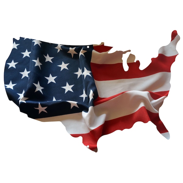 Our USA shape with the waving flag image in a smaller size. Laser cut from steel. Powder coated for weather resistance and durability. Dye-sublimated for a vibrant full image. Screw holes are provided to attach the piece to a wall. Dimensions: 12 in. L x 8 in. H x 1 in. D Weight:1lb