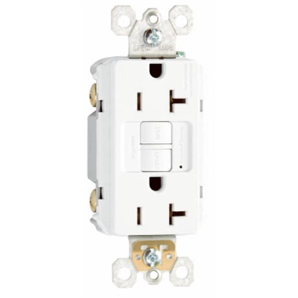 Features -20 Amp. -Voltage - 125V. -Color - White. -2 Pole 3 Wire Grounding. -Heavy Duty Self Testing GFCI Outlet. -Safelock Protection. -If Critical Components Are Damaged & Ground Fault Protection Is Lost Power To Receptacle Is Disconnected. -Line & Load Termination Supplied Backed Out & Ready To Wire. -Unbreakable Thermoplastic Construction. -Supplied With Matching Wall Plate. -UL Listed. -Dimension - 2.95 x 1.73 x 4.69 in. -Item Weight - 0.35 lbs.