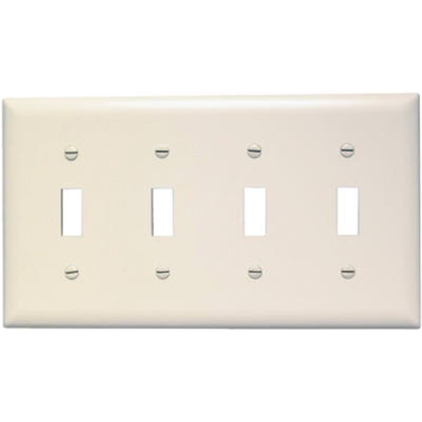 Features -Nylon Wall Plate. -Color - Light Almond. -4 Gang. -4 Toggle Opening. -0.18 in. Taller & Wider Than Standard Size. -Molded Of Rugged Practically Indestructible Self Extinguishing Nylon. -UL Listed CSA. -Cello Wrap. -Dimension - 0.9 x 3.25 x 4.9 in. -Item weight - 0.18 lbs.