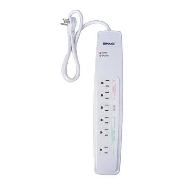 Woods Wire 6 Outlet Surge Protector. Save energy and money while protecting valuable household electronics from harmful and damaging surges. Automatically turns off up to 3 devices, eliminating phantom power loss. 1500 Joules Surge protection, 6 Grounded outlets, 1-transformer outlet to fit large adapter plugs without blocking use of other outlets. 3ft cord length. White