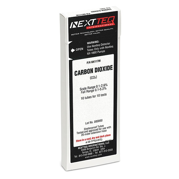 Detector Tube, Measurement Range 0.1 to 2.6 Percent/0.2 to 5.2 Percent vol, Gas Detected Carbon Dioxide, For Use With 20 m Extension Hose, Mfr. No. NX-1000, Color Change Purple Blue to Pale Pink, Operating Temperature - Minimum 32 Degrees F, Tube Material Glass, Break-Off Tip Yes, Calibrated Yes, Product Type Gas Detection Tube, Sampling Method With Pump, Shelf Life 2 yr