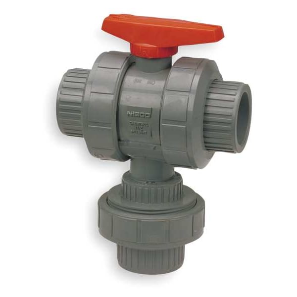 Ball Valve, Body Material CPVC, Body Style 3-Way True Union, 2-Piece, Pipe Size 1 1/4 in, Connection Type Socket x Socket x Socket, Full Port, Max. Pressure 150 psi CWP, Temp. Range 73 Degrees to 210 Degrees F, Ball Material CPVC, Seat Material PTFE, Stem Type 1-Piece Stem, Handle Type Lever, Handle Material PVC, Stem Material PVC, Body Seal Material FPM
