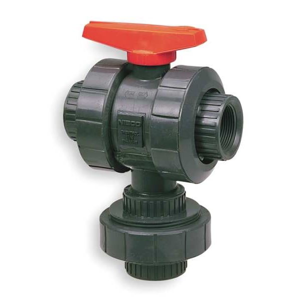 Ball Valve, Body Material PVC, Body Style 3-Way True Union, 2-Piece, Pipe Size 1 1/2 in, Connection Type FNPT x FNPT x FNPT, Full Port, Max. Pressure 150 psi CWP, Ball Material PVC, Handle Material PVC, Stem Material PVC