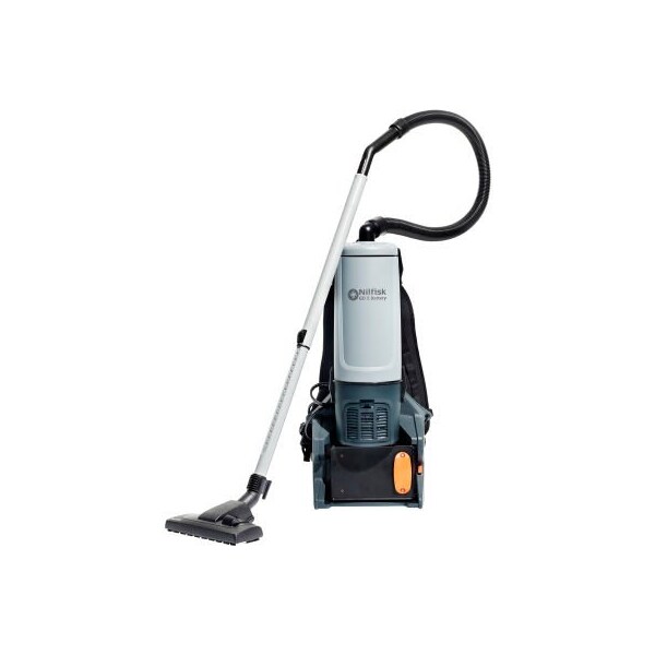The nilfisk gd 5 battery vacuum cleaner a complete battery operated solution with best in class upstream hepa filtration, leaving the need for cords and power outlets behind you. The gd 5 delivers long runtime, fast battery charge and easy to maneuver, lightweight design. 17.6 lb. With battery, 40 minute charge time, 1,000 full charge cycle lifetime. The backpack design will let you work with ease being compact and mobile, the nilfisk gd 5 battery will deal effectively with dust in facilities with limited space between seats, tables, and shelves. The machine is an ideal choice for cafes, restaurants, shops, cinemas, auditoriums and conference rooms, as well as transportation. When the going - and the dirt - gets tough, just turn on the boost function and extra suction power will be added to ensure an optimal cleaning performance. It all happens at a speed which cannot be matched by mains powered vacuum cleaners, and thanks to the best in class sound pressure level from just 60 db(a), daytime cleaning is an option worth considering. Adding to this extreme mobility, the machine has a long runtime and best in class charge time of only 40 minutes to ensure an extraordinary productivity. Switching between two 36v lithium batteries will enable you to work non-stop. Just put it on and get going features: maximum freedom and mobility thanks to the cordless and ergonomic backpack design high productivity with up to 60 minutes of runtime on a fully charged 36v lithium battery best in class charge time of only 40 minutes offers continuous cleaning with the use of two batteries safer cleaning environment for guests, visitors and the operator with no cord to trip over optimal performance with boost function adds suction power for heavy duty cleaning low sound pressure level enabling cost-effective daytime cleaning optional hepa filter available for optimized air quality