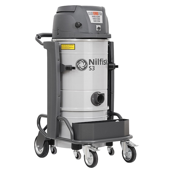 Filtered Vacuum, Vacuum Power Source Corded, Filter Efficiency 99.1 Percent at 1.5 microns, Vacuum Filtration Type HEPA, Vacuum Pickup Type Wet/Dry, Vacuum Air Flow 270 cfm, Static Pressure 72 in, Sound Level 71 dBA, Tank Material Steel, Tank Size 13 gal, Vacuum Collection Type Bag, Peak Horsepower 3 hp, Current 15.8 A, Frequency 60 Hz, Voltage 120V AC, Height 51 1/4 in, Length 31 1/2 in, Width 23 5/8 in, Weight 150 lb, Vacuum Hose Dia. 2 3/4 in, Vacuum Hose Length 20 ft, Power Cord Length 30 ft