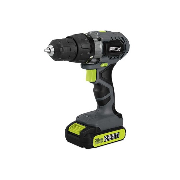 Master Mechanic, 20V, 38, LithiumIon Compact Cordless Drill Kit, 2 Speed, Reversible, Variable Speed Trigger Switch With Brake, Ergonomic Design, 0400, 01500 RPM, 300 INLB Torque, 22 Torque Settings, On Board Trigger Activated LED Work Light, Over Molded Soft Grip Handle, Includes 15Ah Samsung Battery With Charge Indicator 1 Hour Quick Charger, For Replacement Battery Use TV 211881 Charger TV 211880