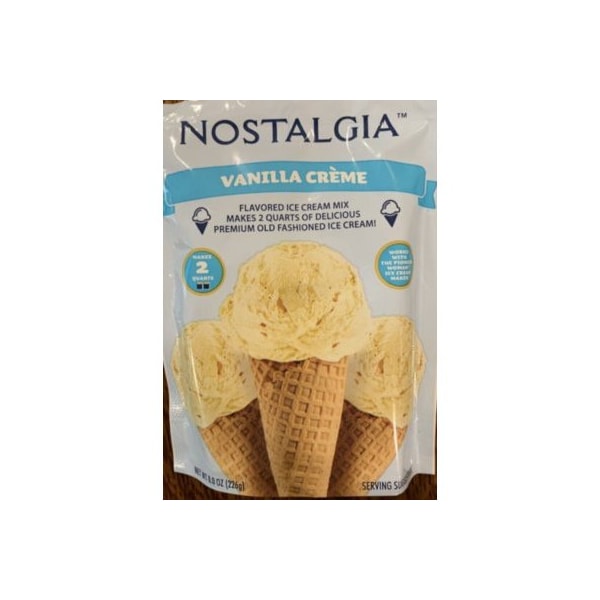 8 oz Vainlla Ice Cream packets Make delicious homemade ice cream with all Nostalgia and other quality ice cream makers Simply combine mix with milk and heavy cream, and fill your ice cream canister, churn and enjoy Makes 2 quarts